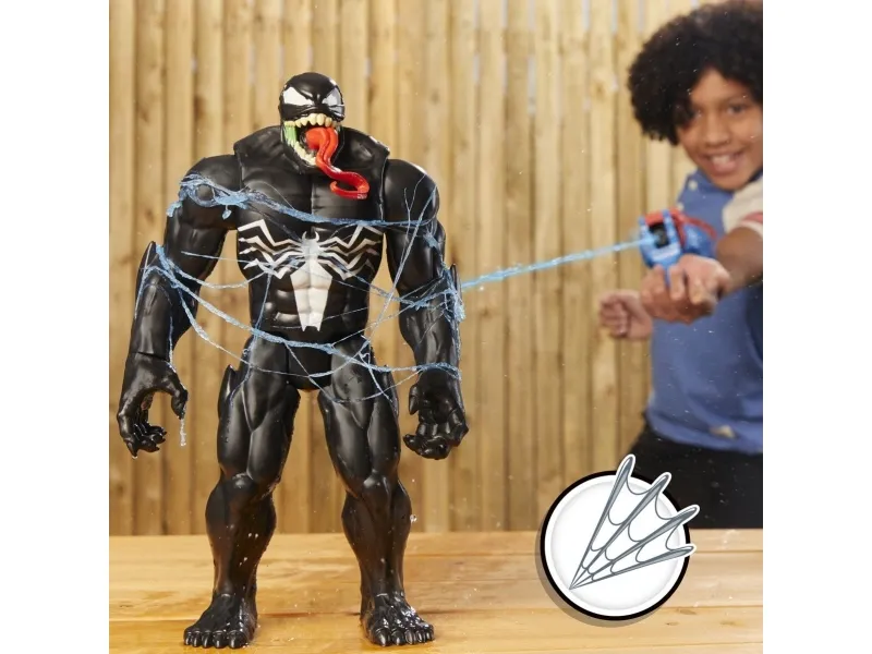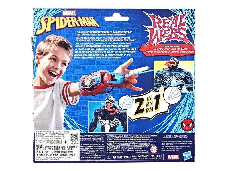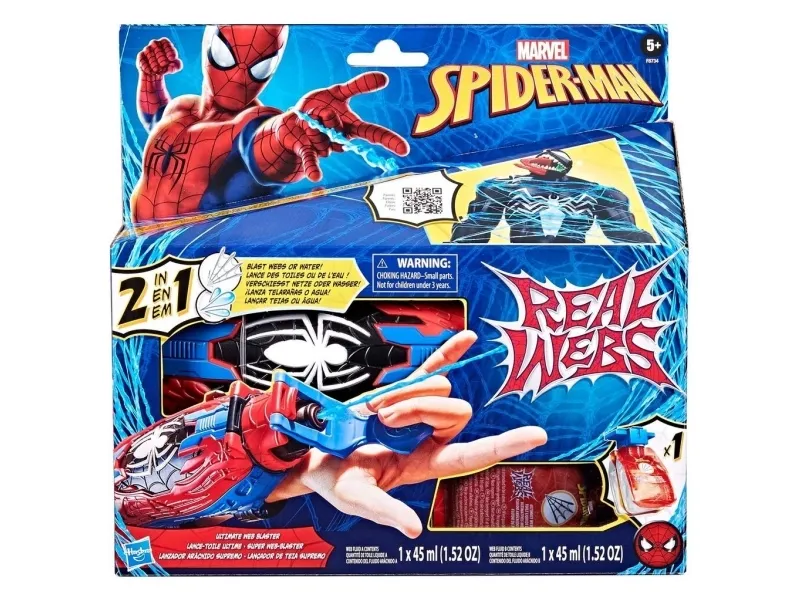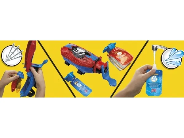 Ready to THWIP and blast realistic webs, just like Spider-Man? The Ultimate Web Blaster features an innovative web fluid that turns into a gel-like webbing you can play with! This blaster features the latest web tech with 3 ways to play. Kids ages 5 and up can strap blaster onto their wrist, show off their best Spider-Man THWIP pose, and push button to blast webs or water! Play with webs to imagine capturing Spider-Man's latest foe; drape around action figures or playsets (sold separately) to create your own webtastic world of Spider-Man! Blaster includes 1 Real Webs pouch (refills available, sold separately), and 1 refillable water pouch. The Ultimate Web blaster is a great Spider-Man gift for boys and girls, and can be a fun, action-packed addition to Spider-Man costumes, or paired with a Spider-Man mask! Copyright MARVEL. All trademarks and registered trademarks are the property of their respective owners. Hasbro and all related terms are trademarks of Hasbro.