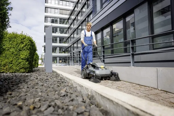 The KM 70/25 C manual sweeper is an effective and efficient solution for cleaning hard surfaces in- and outdoors. The sweeping roller and side brush are battery-powered and significantly increase working comfort: users can sweep corners and hard-to-reach areas effortlessly with significantly less force required. The foam filter with passive suction reduces dust and keeps the working environment clean. The sweeper roller can be adjusted in six stages to adapt its cleaning performance to different surfaces. The practical shelf for additional equipment, such as buckets and litter pickers, makes work easier. Maintenance is also simple, with no tools needed to change the side brush and filter. The 36 V Kärcher Battery Power battery platform delivers sufficient power in every situation. The exchangeable battery can be removed for easy transport. The battery and battery charger are not included in the scope of delivery.