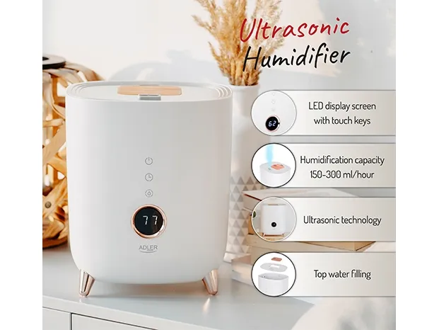 The Adler ultrasonic humidifier will surprise you with its advanced technology and functionality that will allow you to create ideal conditions for air humidity in your interior. The device is equipped with an LED display with touch buttons, thanks to which it will provide convenient operation and precise control over humidification. Thanks to the unique design that allows you to fill the water tank from the top, using the humidifier has become even easier and more ergonomic. The device monitors and displays the current room humidity in real time, allowing you to keep track of the conditions.