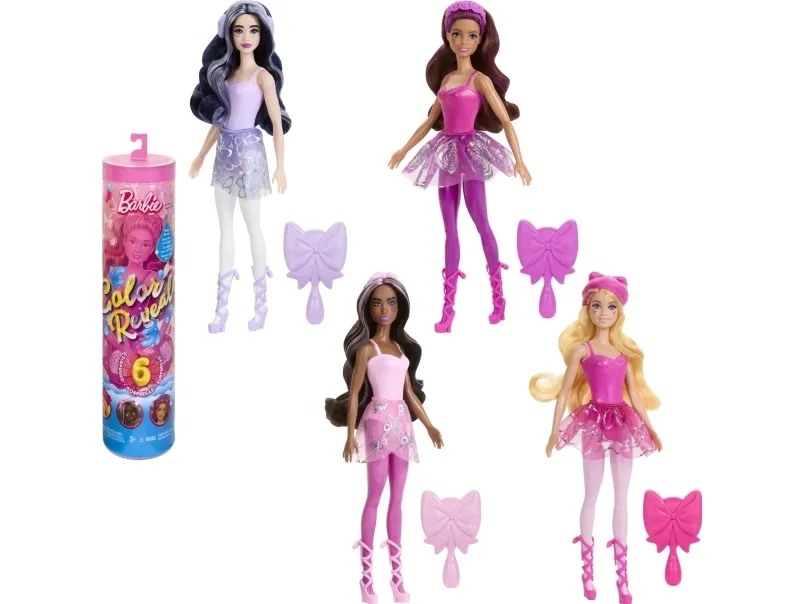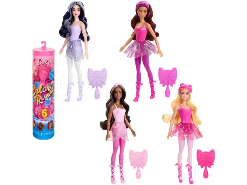 Barbie Colour Reveal dolls deliver an unboxing experience full of surprises, six of them! With this series inspired by balletcore fashion, kids find one of four unique dolls -- each features long hair with a brightly coloured streak. Which doll will you reveal? Fashions and accessories include a ballet-inspired skirt, unique head piece, lace-up platform ballerina shoes and a bow brush. Also includes a makeup colour-change feature on the doll's face. Use the packaging tube to store these and other pieces. Kids can collect them all for mix and match fun. Each sold separately, subject to availability. Dolls cannot stand alone. Colours and decorations may vary.Barbie Color Reveal Doll Assortment. Doll type: Fashion doll, Doll's gender: Female, Recommended age (min): 3 yr(s). Height: 325 mm. Material: Fabric, Plastic, Product colour: Assorted colours
