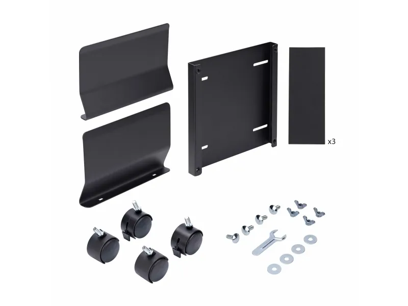4 x styrehjul, 2 x side walls, base, 2 x side walls anti-slip pads, base anti-slip pad, 4 x assembly screws, 4 x wing nuts, 4 x spændeskiver, nøgle