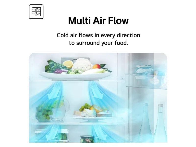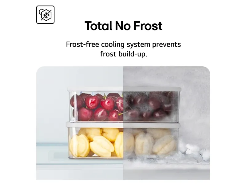 Total No Frost Cold air is circulated throughout freezer and refrigerator both compartments by cooling fan. Fan forces circulation and makes fast air flow. Especially, Multi air flow, which has lots of air holes makes every corner cool.