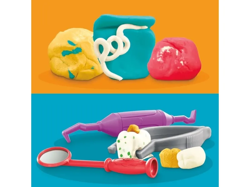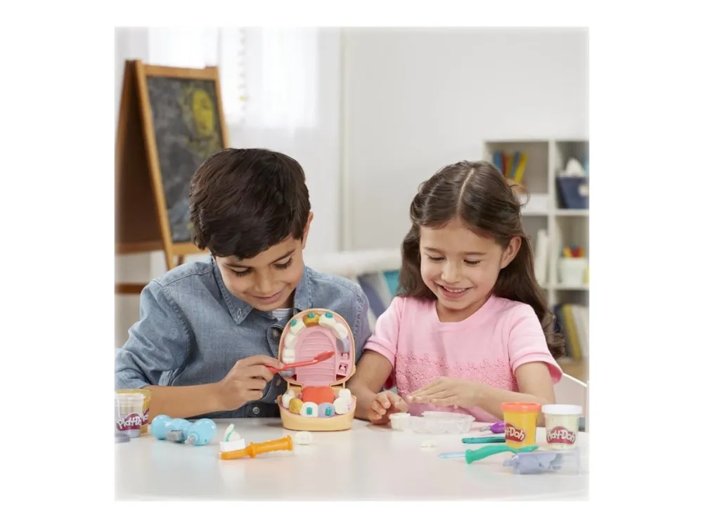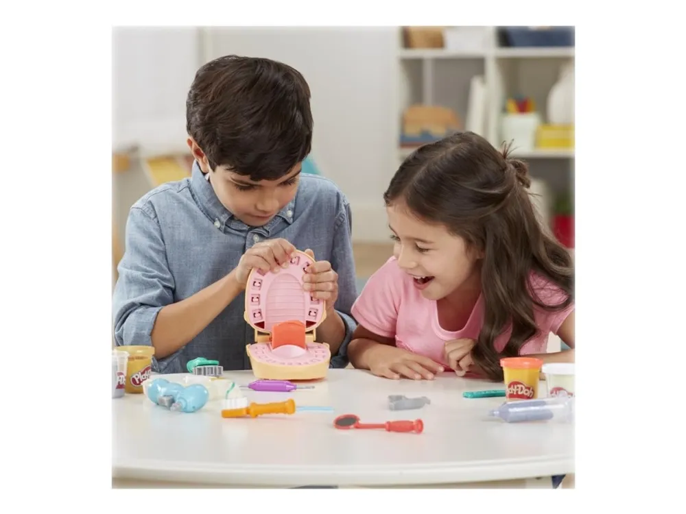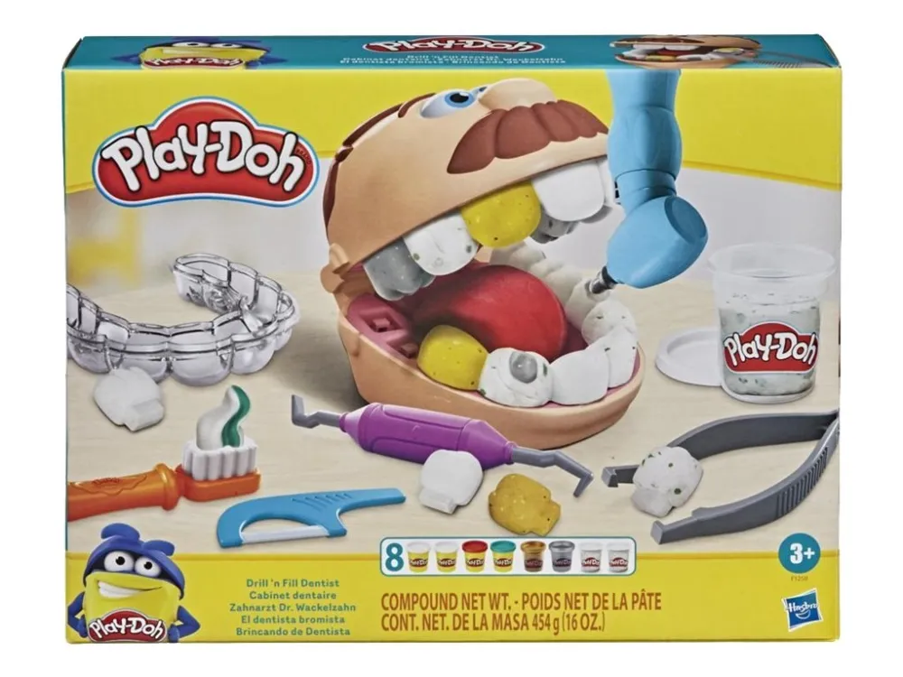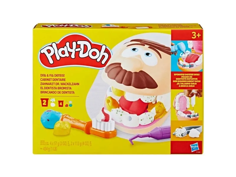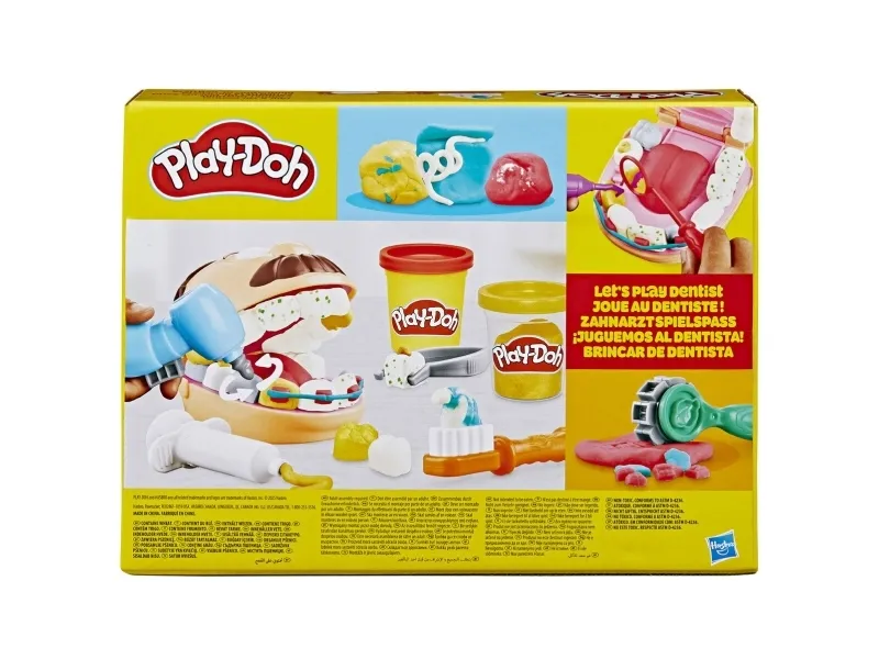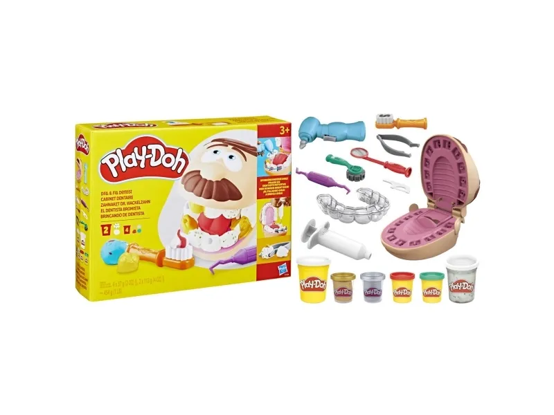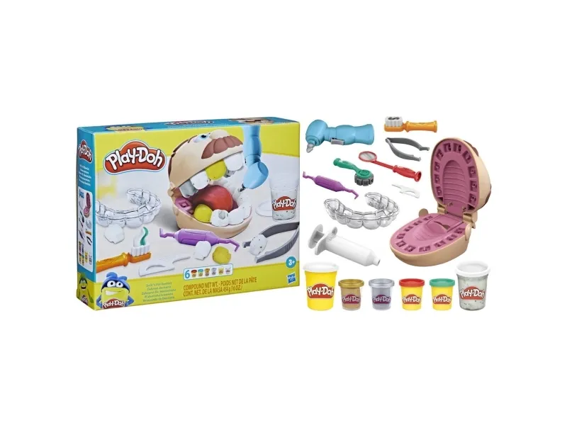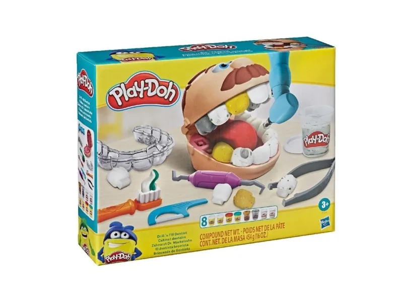 Doctor, drill 'n fill that patient before he gets a toothache! Even if it can be a little scary to go to the dentist, kids can take control and play pretend dentist with this Play-Doh playset. They can make the patient stick out his Play-Doh tongue, then use the toy tooth mold to create a whole row of Play-Doh teeth at once. Start drillin' and fillin' with the hand-powered toy drill and syringe extruder tool. Cavity-colored modeling compound has green speckles to look like the patient has gunk in his teeth, and gold and silver Play-Doh colors make great braces and fillings. With a total of 10 toy dental tools and 8 non-toxic Play-Doh cans, this toy dentist kit makes a great activity or gift for kids 3 years and up!Play-Doh Drill 'n Fill Dentist. Product type: Children's pottery kit, Recommended age (min): 3 yr(s), Product colour: Multicolour. Number of pieces: 18 pc(s). Package type: Closed box