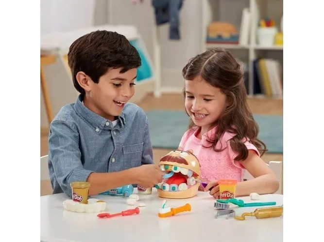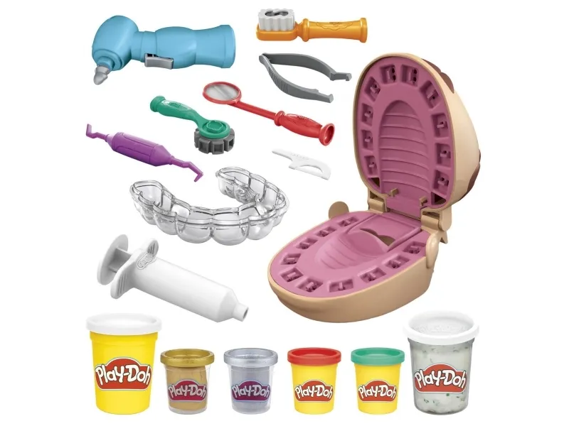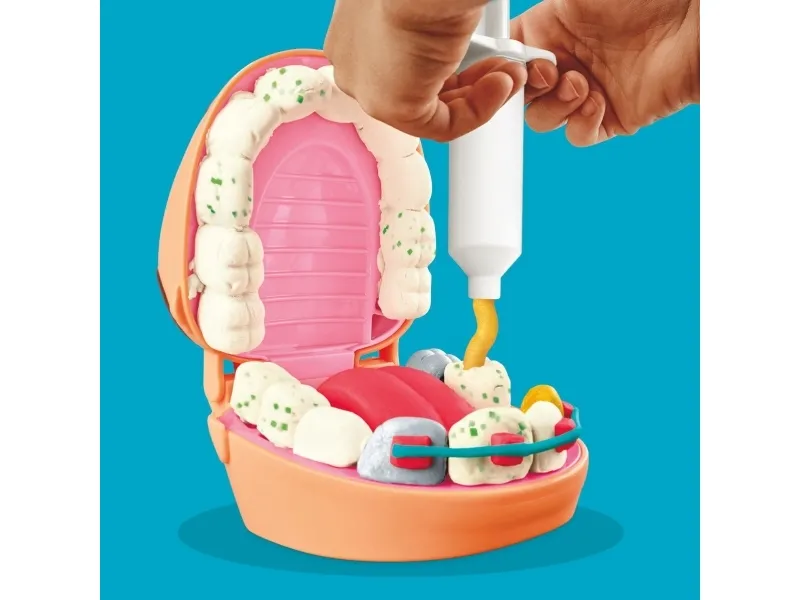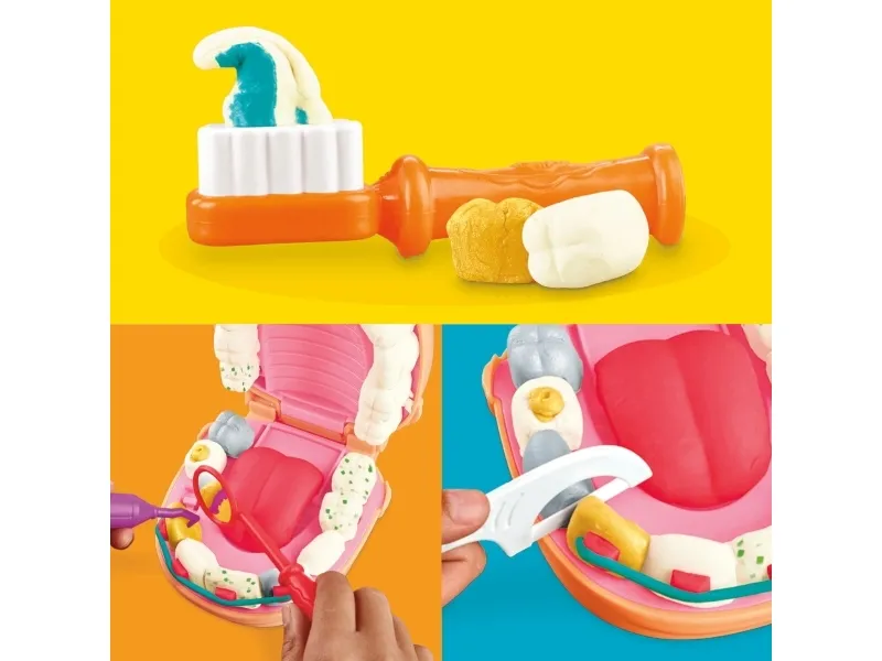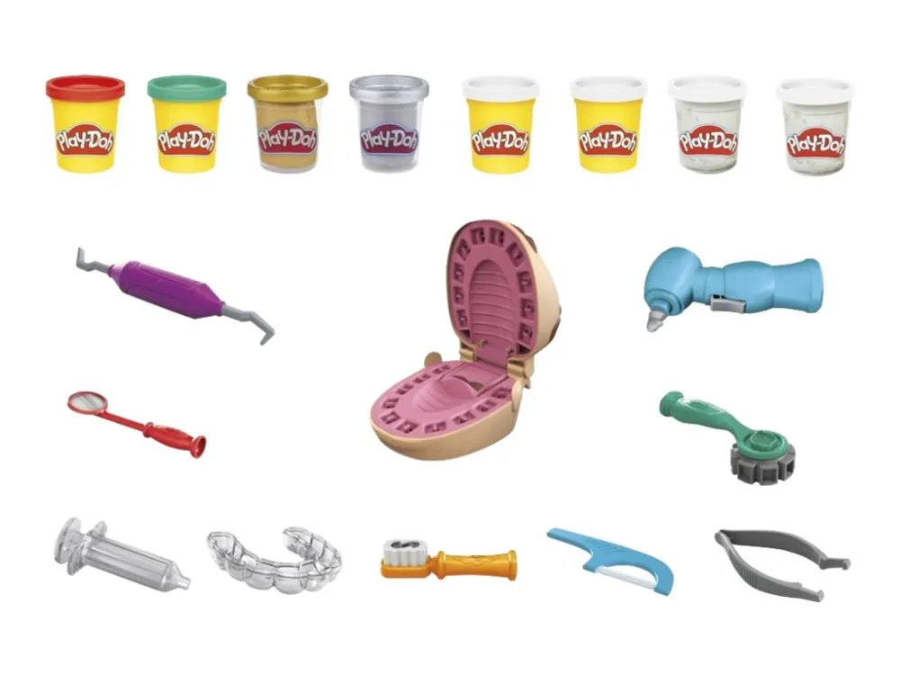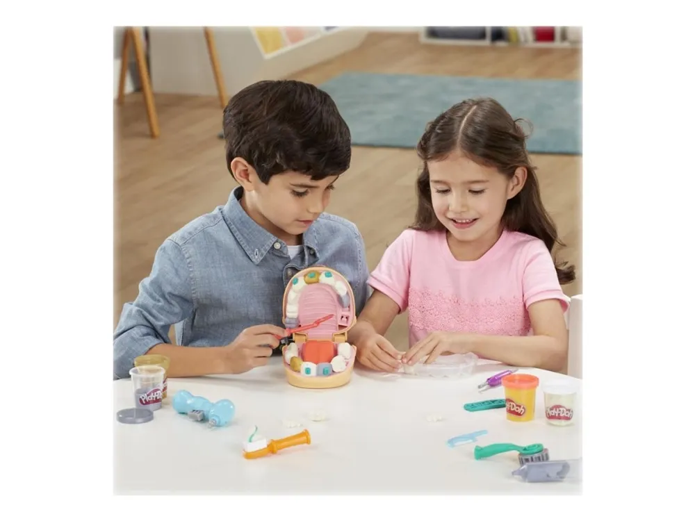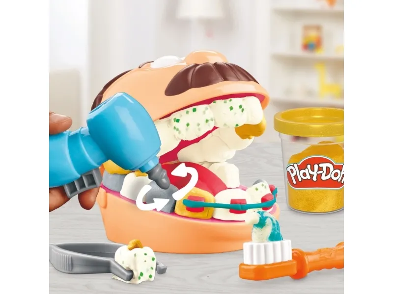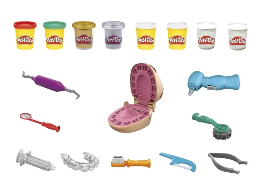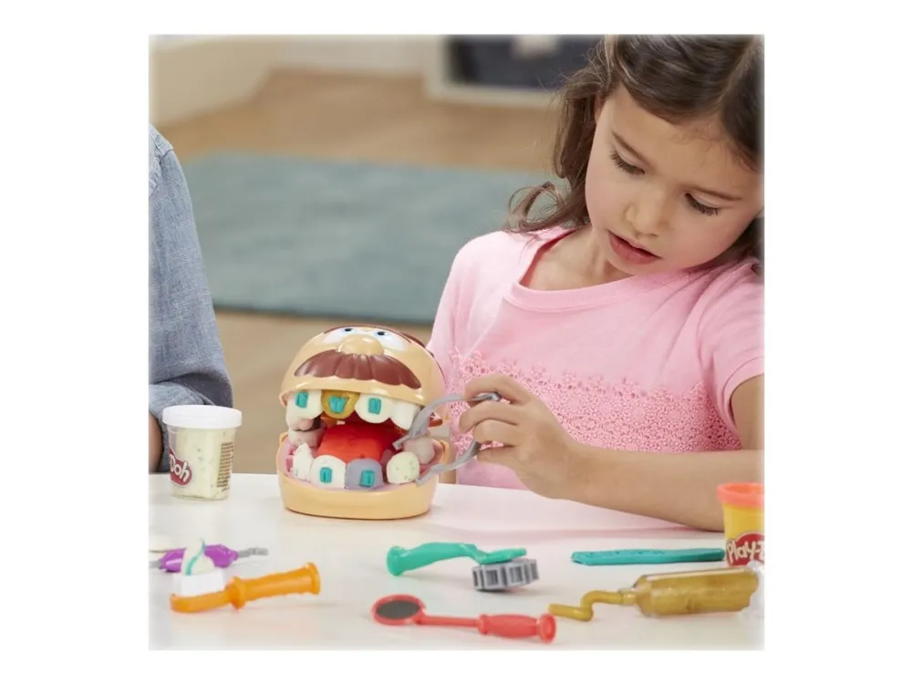 Doctor, drill 'n fill that patient before he gets a toothache! Even if it can be a little scary to go to the dentist, kids can take control and play pretend dentist with this Play-Doh playset. They can make the patient stick out his Play-Doh tongue, then use the toy tooth mold to create a whole row of Play-Doh teeth at once. Start drillin' and fillin' with the hand-powered toy drill and syringe extruder tool. Cavity-colored modeling compound has green speckles to look like the patient has gunk in his teeth, and gold and silver Play-Doh colors make great braces and fillings. With a total of 10 toy dental tools and 8 non-toxic Play-Doh cans, this toy dentist kit makes a great activity or gift for kids 3 years and up!Play-Doh Drill 'n Fill Dentist. Product type: Children's pottery kit, Recommended age (min): 3 yr(s), Product colour: Multicolour. Number of pieces: 18 pc(s). Package type: Closed box