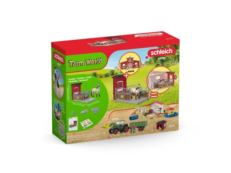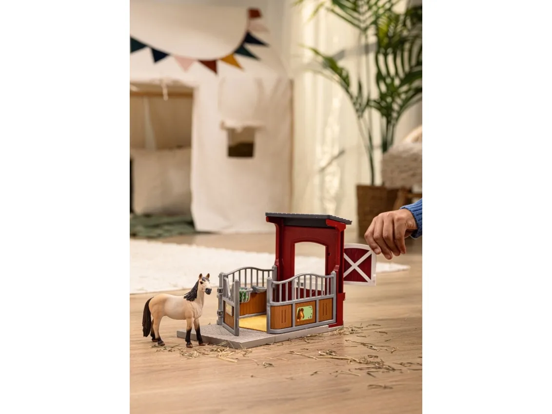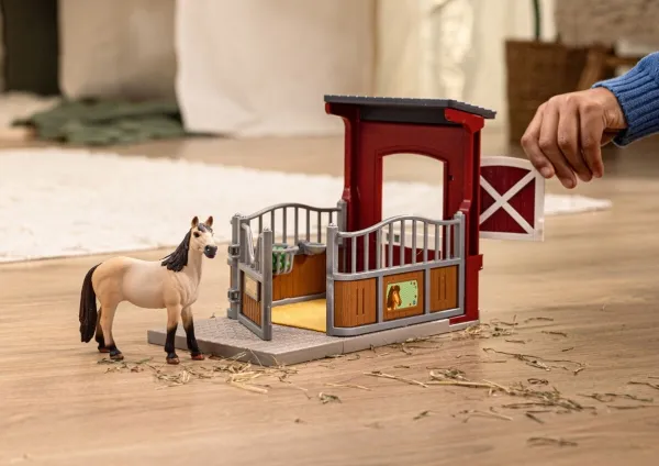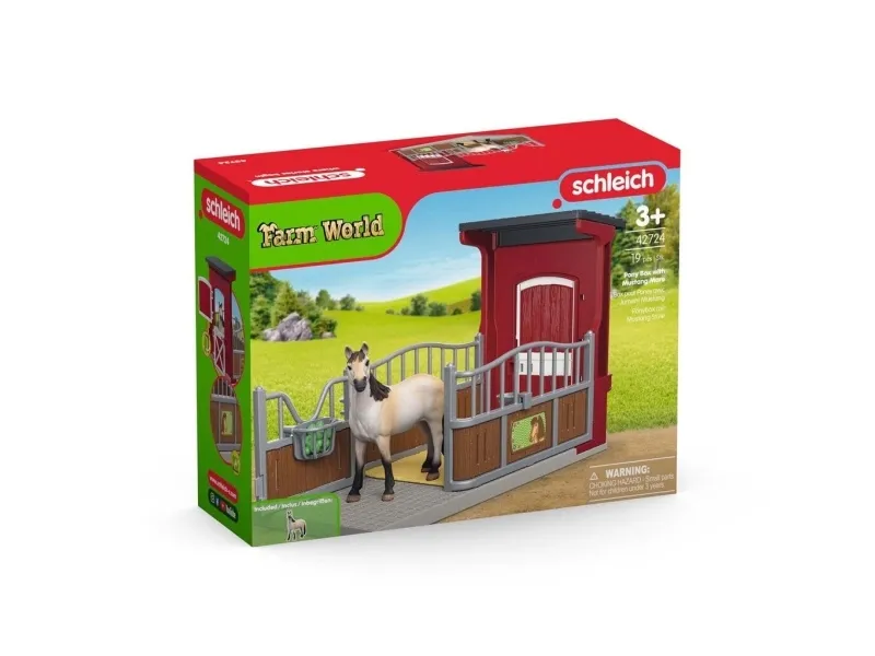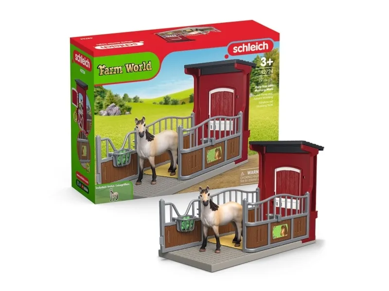 The pretty, cream-colored mustang mare with the dark mane is standing in the bright red pony box. The box is really cozy. The floor is covered with fresh straw and there are even a few crunchy apples to munch on in the metal trough. There is also a bowl of water on the wall. The mare really lacks nothing. All she needs is a name. There's space on the sign outside the box. Who's got an idea? schleich FARM WORLD Pony Box with Mustang Mare. Type: Animal, Theme: Buildings, Farm animals / farm toys, Horse Stable, Horses, Recommended age (min): 3 yr(s), Recommended age (max): 8 yr(s), Minimum number of players: 1, Product colour: Multicolour