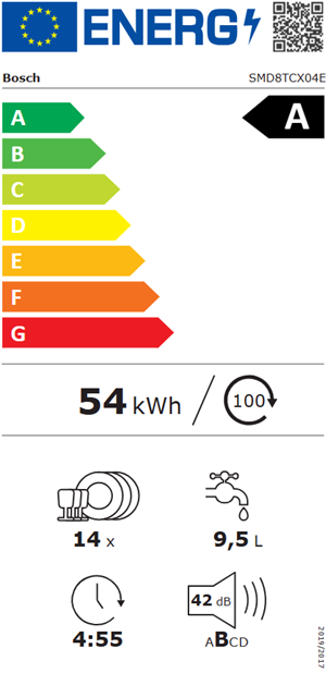 Bosch Serie 8 SMD8TCX04E. Appliance placement: Fully built-in, Product size: Full size (60 cm), Control panel colour: Black. Number of place settings: 14 place settings, Noise emission class: B, Noise level: 42 dB. Feet adjustment: 6 cm, Apps functions: Remote start. Energy efficiency class: A, Water consumption per cycle: 9.5 L, Energy consumption per 100 cycles: 54 kWh. Width: 598 mm, Depth: 550 mm, Height: 815 mm