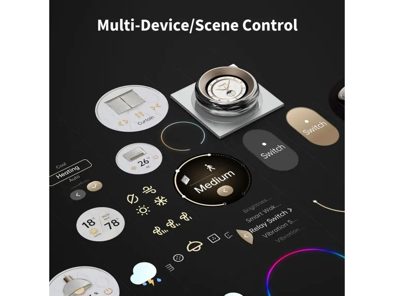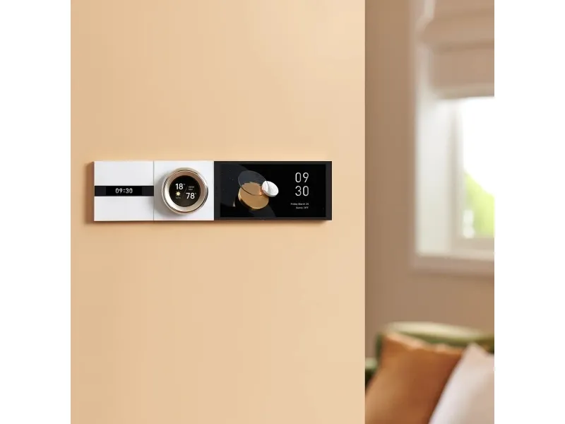 Display Switch V1 EU is a two-channel neutral wall switch which equipped with four physical buttons and a 2.08-inch LCD screen. It can be customized with texts that match the device and user habits, which can help users to clearly understand which device each button controls. Its power monitoring function can help users improve energy efficiency. With matter over bridge, users can access the switch in the third-party ecosystem.