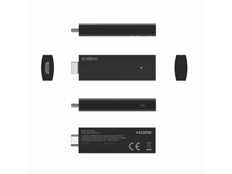 Strong LEAP-UNA. HD type: 2K Ultra HD, Operating system installed: Android, Supported video modes: 480i, 480p, 576i, 576p, 720p, 1080i, 1080p, 2160p. Device interface: HDMI, Wi-Fi standards: 802.11a, 802.11b, 802.11g, Wi-Fi 4 (802.11n), Wi-Fi 5 (802.11ac). AC adapter frequency: 50 - 60 Hz, AC adapter input voltage: 100 - 240 V, Power consumption (typical): 5 W. Product colour: Black. Internal memory: 1000 MB, Internal memory type: DDR4
