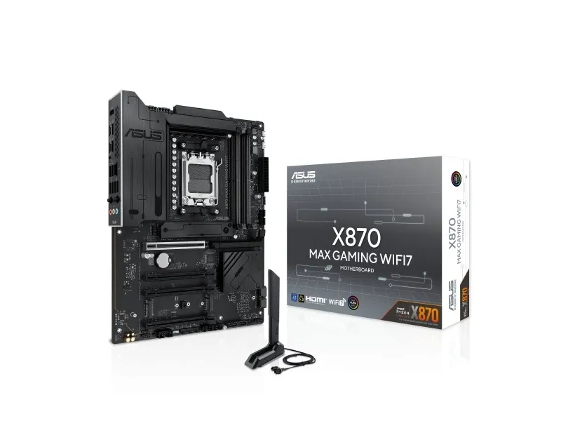 The ASUS X870 MAX GAMING WIFI7 motherboard offers a robust foundation for gaming and computing performance. Equipped with support for Ryzen 7000/8000/9000 Series processors, this motherboard utilizes the AMD X870 chipset and provides an array of features that ensure fast data processing and an enhanced user experience. With support for DDR5 RAM running up to 4000 MHz, users can enjoy faster load times and better multitasking capabilities.