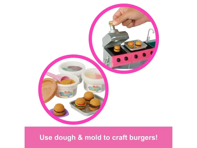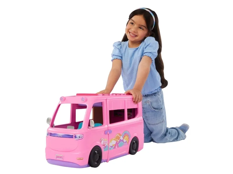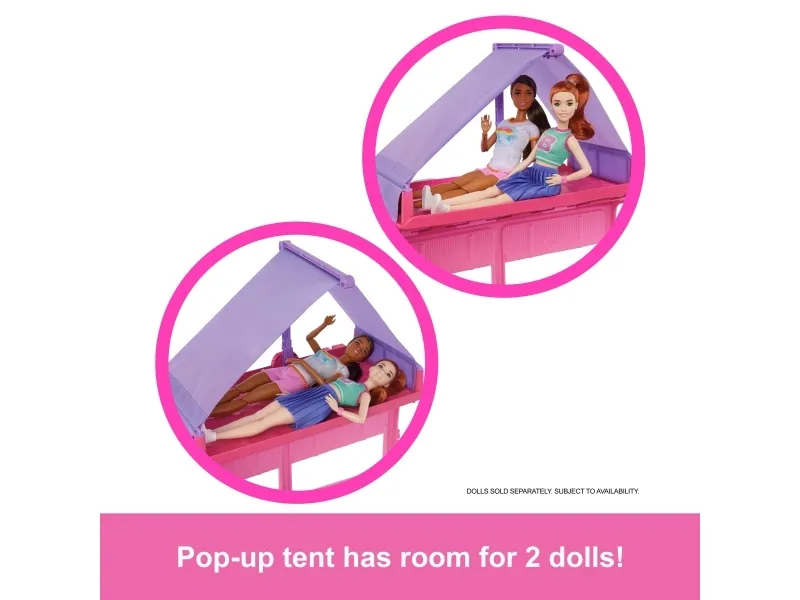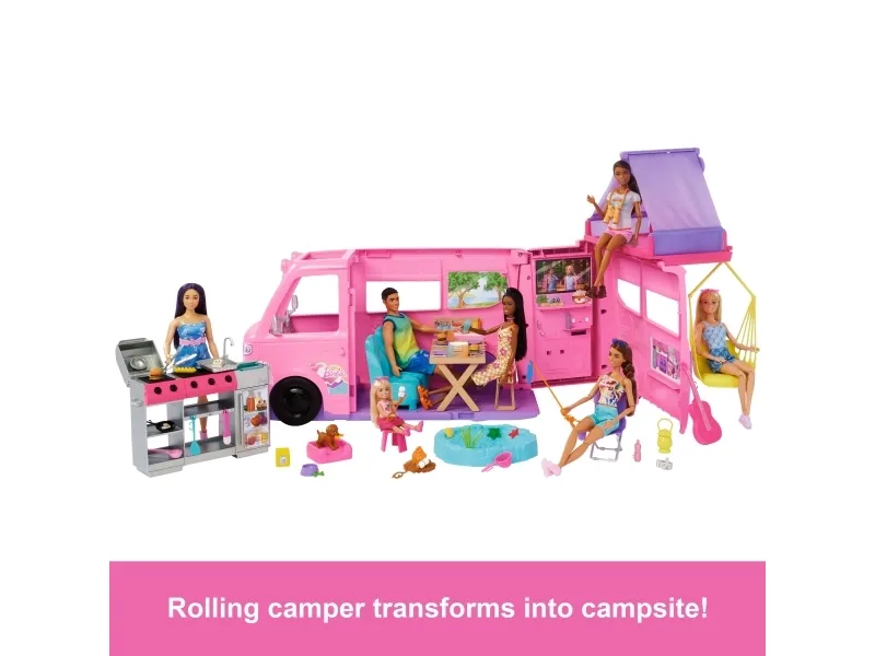 Adventure awaits with the Barbie Dream Camper playset, featuring seven play areas and more than 60 accessories to play out adventures in the great outdoors! Give the camper a push to drive into playtime, then unfold it to reveal a pop-up roof tent, living room, dining area, and bathroom. There's so much fun to be had -- go fishing in the pond, relax in the swing chair, and set up space for the adorable pet puppy. When it's time for dinner, use the included dough to whip up burgers for Barbie doll and friends (sold separately) or grill up fun on the barbeque -- watch the food transform as it 'cooks' with colour-change action! With so many storytelling opportunities, the Barbie Dream Camper playset is a gift packed with fun for kids 3 years old and up, especially those who love the outdoors! Dolls not included. Colours and decorations may vary.Barbie Dream Camper Playset with Roof Tent, BBQ Grill with Color-Change Feature & 60+ Accessories. Product type: Doll camper, Recommended age (min): 3 yr(s). Weight: 3.5 kg