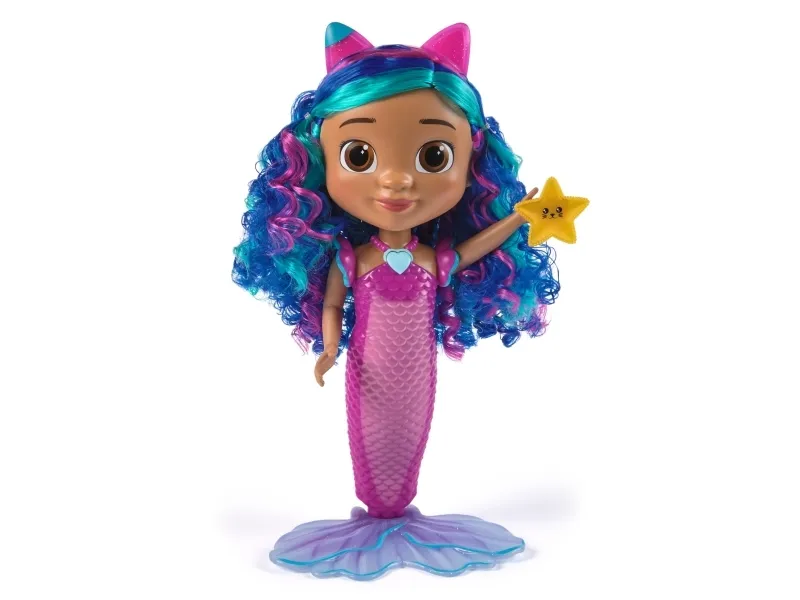 Includes: 1 Mermaid Gabby, 1 Starfish accessoryGabby's Dollhouse: The Movie, Sing & Shine Mermaid Gabby, Waterproof Mermaid Doll with Lights & Sounds, Kids Toys for Girls & Boys Ages 3 and Up. Doll type: Big doll, Doll's gender: Female, Recommended age (min): 3 yr(s), Suggested gender: Girl, Sounding, Light effects. Height: 350 mm, Weight: 710 g. Product colour: Multicolour