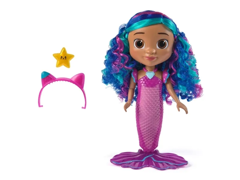 Enter Gabby's magical world of Gabby’s Dollhouse: The Movie with the Sing & Shine Mermaid Gabby! This enchanting Gabby mermaid doll is a treasure trove of lights and sounds, ready for endless adventures. With a simple press on her heart necklace, Mermaid Gabby lights up and plays 14 different sound effects, phrases, and music from Gabby’s Dollhouse: The Movie. This meow-mazing waterproof mermaid toy even changes tail color in warm water, for a splash of magic at playtime. She stands over 14 inches tall & features wavy hair and has charming dollhouse accessories, like a lovable starfish she can hold or wear in her hair, for cat-terrific adventures. This doll is a fun-filled way to inspire pretend play with learning toys and invites meow-mazing explorations, with these adorable Gabby cat toys for kids. Gabbys dollhouse toys are purrfect gifts for kids to relive cherished moments from the Gabby movie, and for creating new adventures in Gabby's dollhouse, with toddler toys for kids, like doll house accessories & furniture, her meow-mazing cat friends and fin-tastic mermaid toys, for endless hours of cat-terrific adventures (each sold separately)
