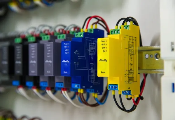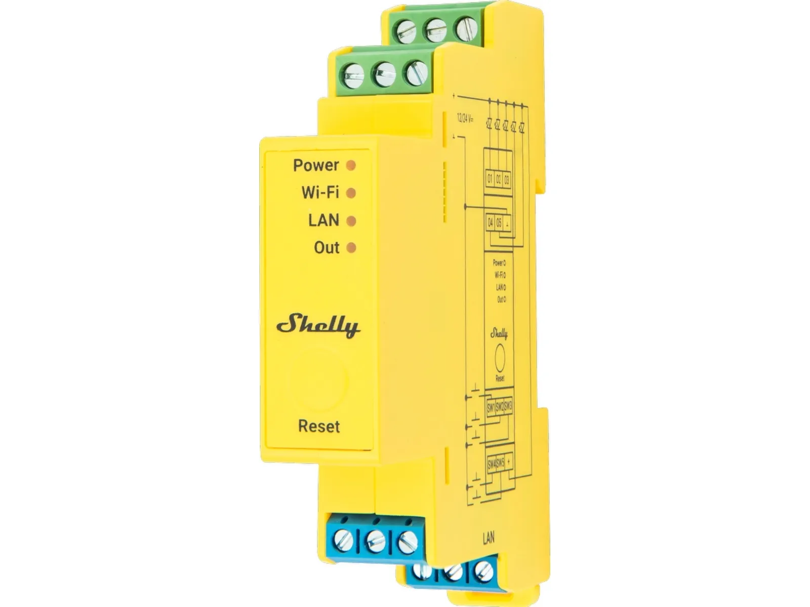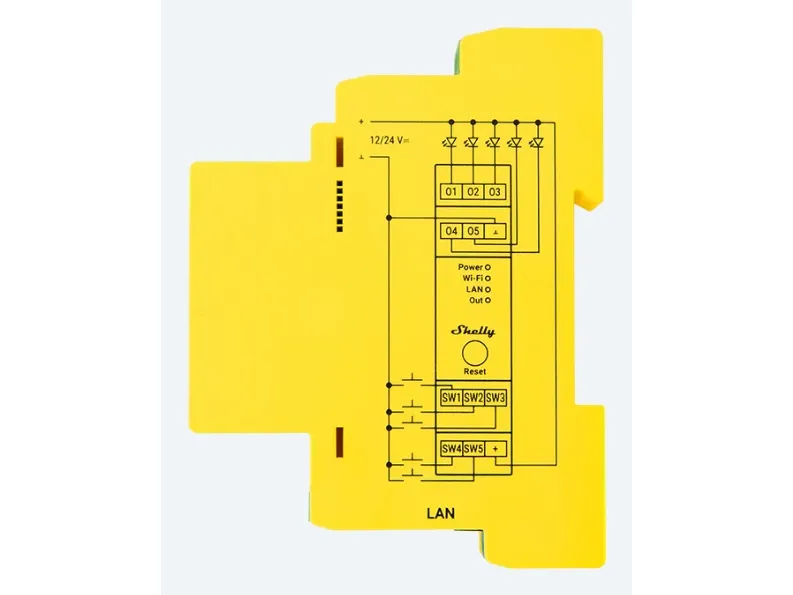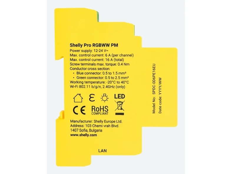 Shelly Pro RGBWW PM is a WiFi-controlled 5-channel controller for 12/24V LED strips with power metering. With its five channels, the device can control RGB, RGBW, RGBWW, or five white LED strips, which can be easily configured in the device settings. The device is designed for installation in the distribution board. Function Shelly Pro RGBWW PM has many built-in features. It must be powered by a standard 12 or 24V LED driver and automatically measures power consumption on each channel, which can be monitored through the Shelly Smart Control app. It can handle the following loads: 12V: 60W per channel (max 192W total load), 24V: 120W per channel (max 384W total load). Shelly devices work 100% locally and only require a local network to operate. Shelly can be used alone in the Shelly Smart Control app or with more than 200 partner systems such as Google Home, Amazon Alexa, Home Assistant, Samsung SmartThings, Athom Homey, and many more. Connection Shelly Pro RGBWW PM can connect to the internet or the local network through a LAN interface and/or 2.4 GHz WiFi. Additionally, the device has built-in Bluetooth like the rest of the Pro, Plus, and Gen3 devices, so it can also be used as a gateway for Shelly Bluetooth devices. The device works locally without connection to Shelly Cloud, but it is recommended to activate it for easy data storage and increased functionality. The device can also communicate via MQTT, HTTP, and WebSocket. All support TLS. Hardware The device is equipped with generation 2 hardware, which includes a powerful ESP32 processor. This allows for scripting functions for advanced and customized functionality as well as a range extender function with the device.