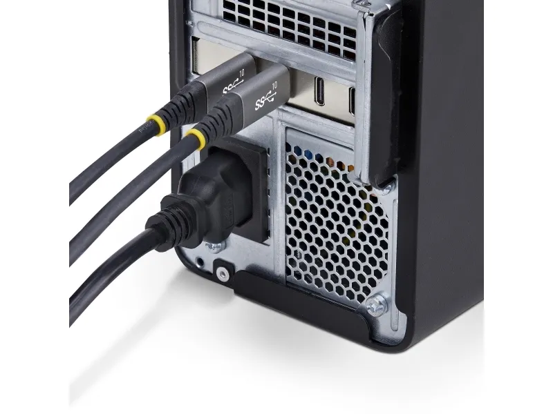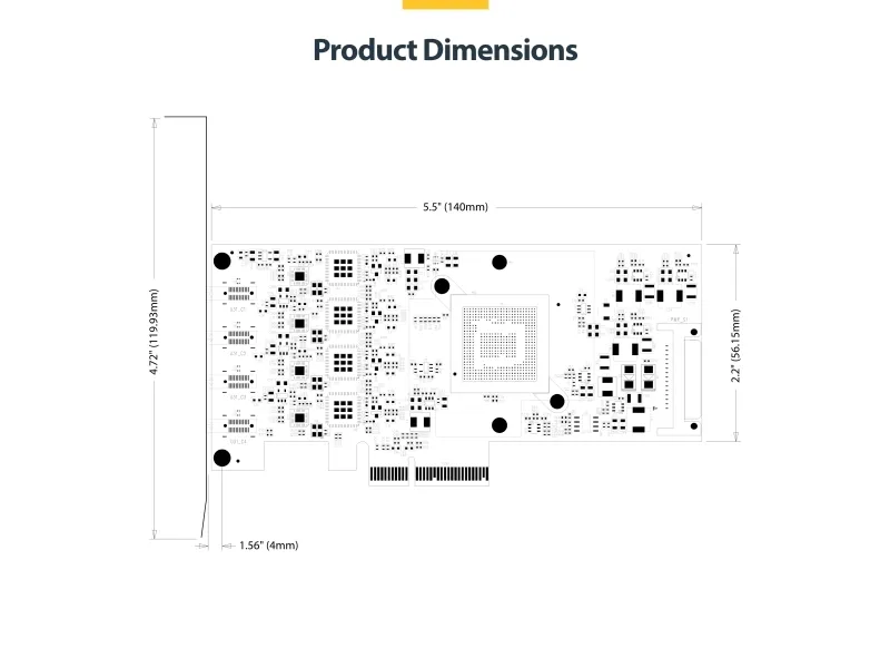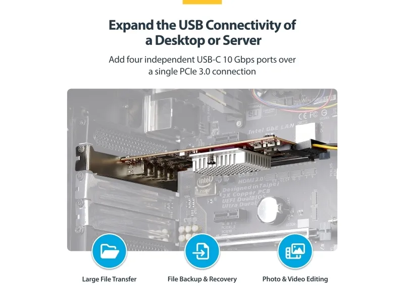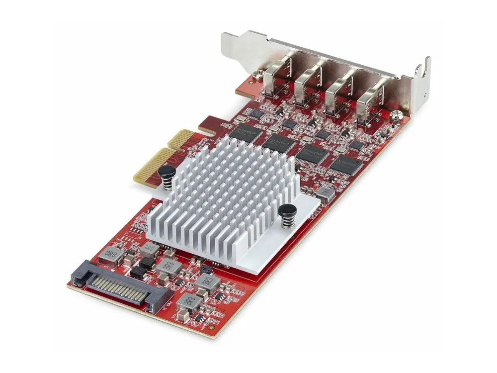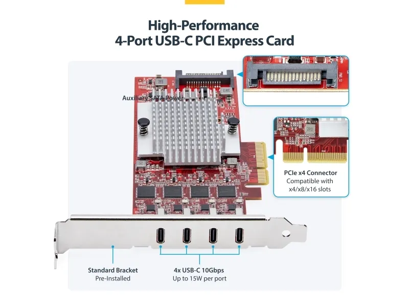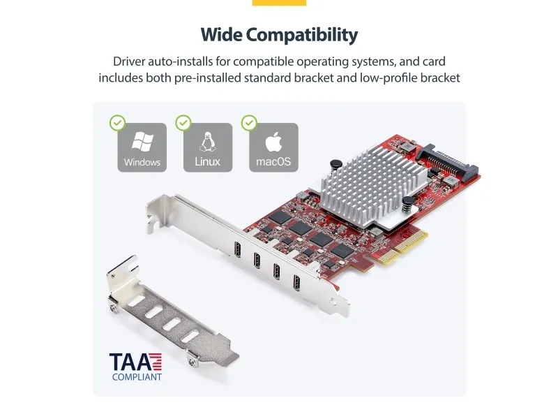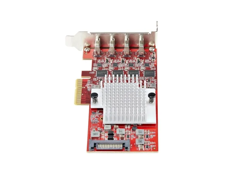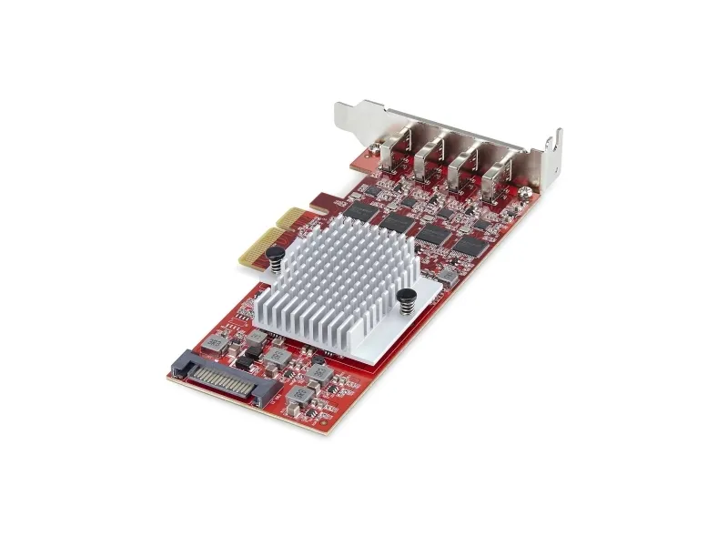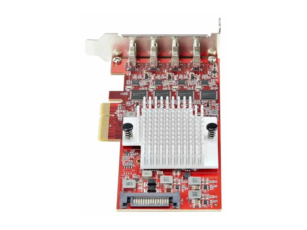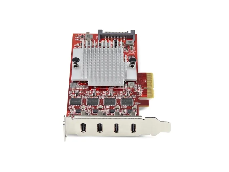 The StarTech.com 4-Port USB Type-C PCIe Card enhances connectivity by providing four USB-C 3.2 Gen 2 ports, allowing for efficient data transfer rates of up to 10 Gbps. This plug-in card is designed for seamless integration into systems with a PCI Express 3.0 x4 interface and is low-profile, ensuring it fits in compact spaces. With built-in SATA power connectors, this card supports both external and internal connections, making it versatile for various setups. It operates reliably within a temperature range of 0°C to 85°C and maintains functionality in humidity levels between 20 to 80% RH, suitable for diverse environments.