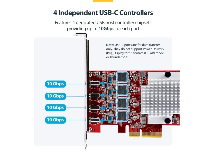 StarTech.com 4-Port USB Type-C PCIe Card, USB-C 10Gb, 4x Controllers, TAA - USB-adapter - PCIe 3.0 x4 - USB-C 3.2 Gen 2 x 4 - TAA-kompatibel
