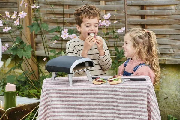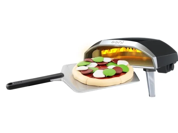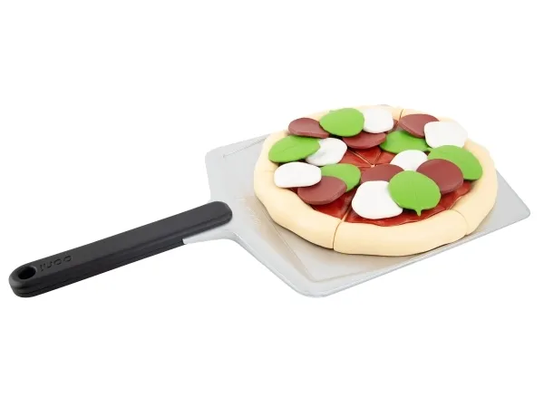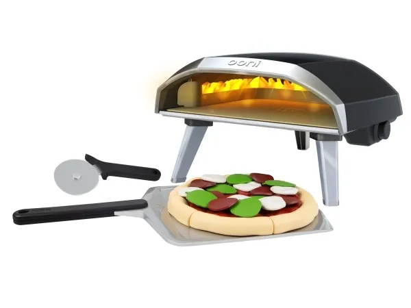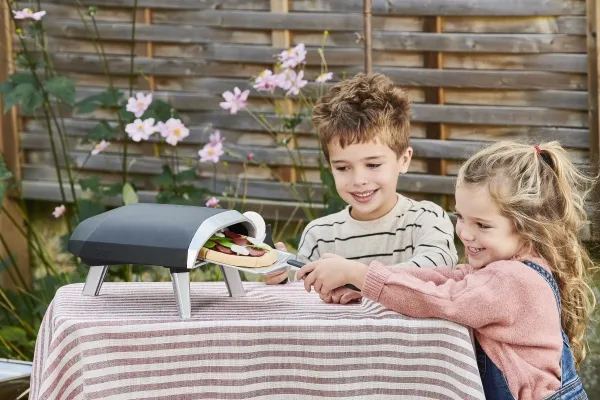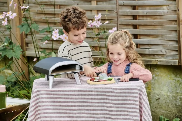 Ooni play oven for little pizza chefs! Click the oven on and the inside of the oven lights up with amazing ligh effects. The kit includes a play oven, a pizza peel and cutter and a play pizza, 33 pieces in total. Batteries 3 x AAA not included. 3+