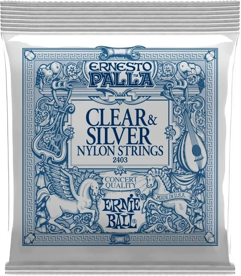 Ernie Ball Ernesto Palla klassiske guitarstrenge i koncertkvalitet er fremstillet af gennemsigtigt nylonmonofilament. De sølvbelagte basstrenge er fremstillet af forsølvet kobber, der er viklet omkring en nylonmultifilamentkerne, hvilket giver en jævn og fyldig klang.
