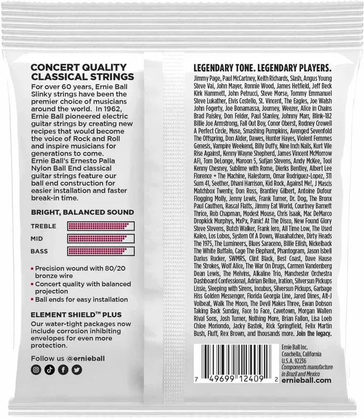 Ernie Ball Ernesto Palla klassiske guitarstrenge i koncertkvalitet er fremstillet af sort nylonmonofilament. De guldbelagte basstrenge er fremstillet af 80/20 bronze viklet omkring en nylonmultifilamentkerne, der giver en jævn, fyldig klang.