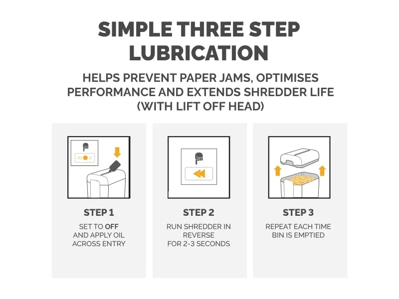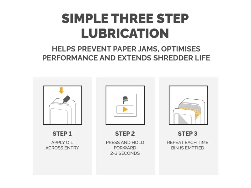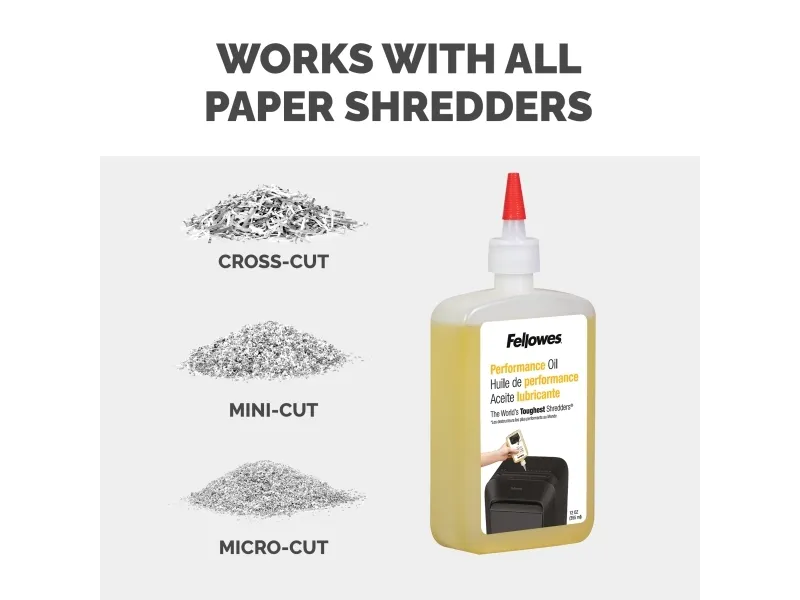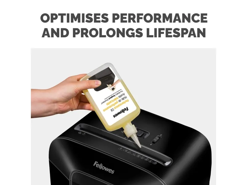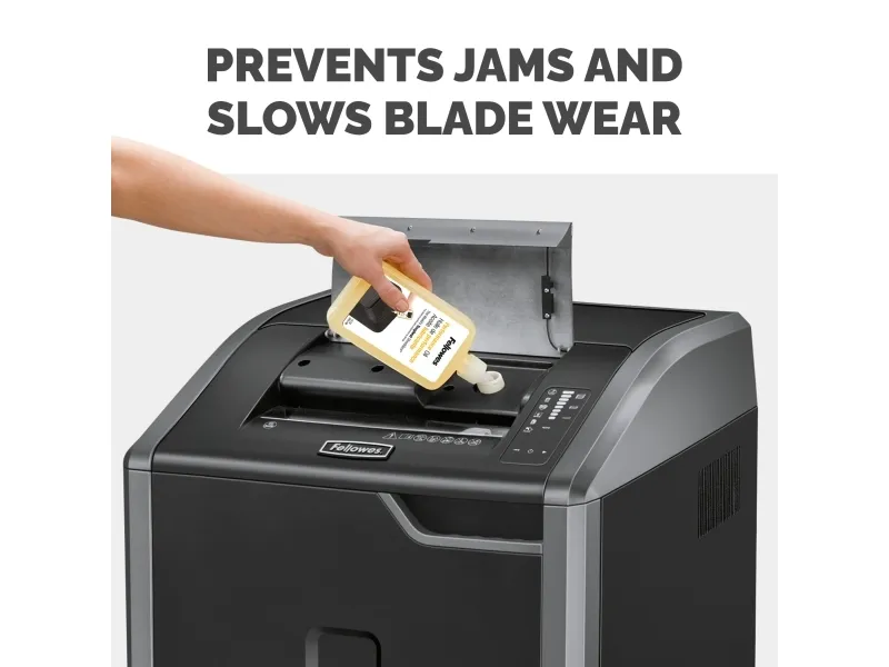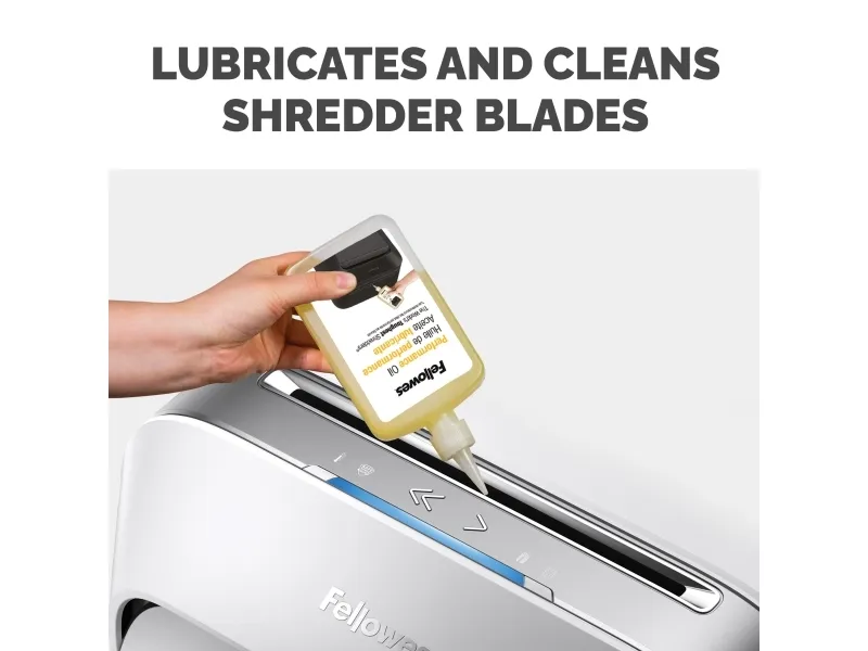 Fellowes POWERSHRED Shredder Lubricant keeps your shredder running at peak performance by conditioning the cutters and extending the life of your shredder. For best results, oil shredder each time you empty the wastebasket or a minimum of twice a month. 12 oz plastic squeeze bottle with extended nozzle ensures complete coverage.