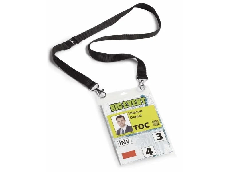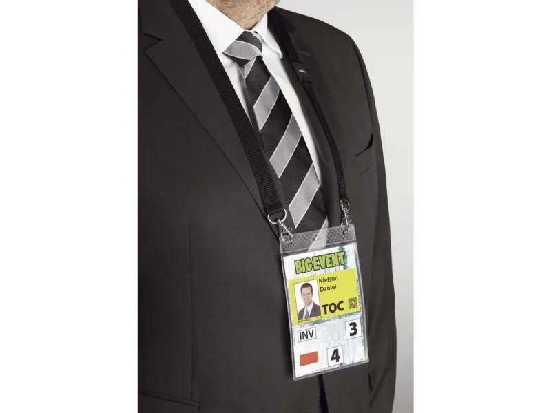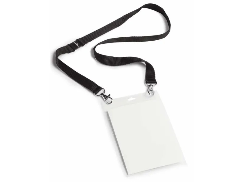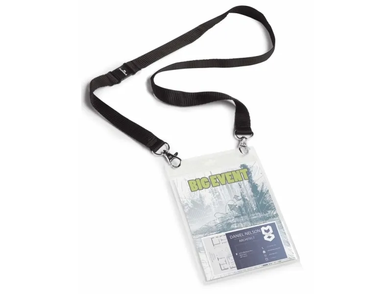 Name badge A6 with textile necklace duo Make an impression at events, conferences and exhibitions with this extra large Name badge. The badge opens at the top for quick insertion and removal of an A6 insert and is combined with a 20 mm textile necklace with two snap hooks and safety release that opens if the necklace gets trapped or caught. Two fastening holes for snap hooks avoid contorting of the badge. Insert size: A6 (portrait format). Length: 88 cm.
