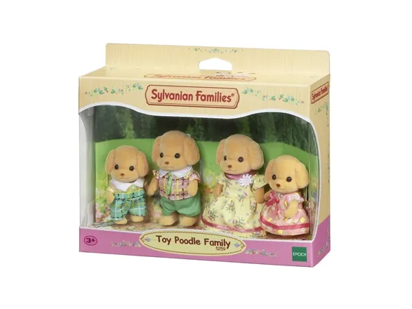 The Toy Poodle father is very kind and is good at sports. On days when he's not working, he plays soccer or catch with the children in the village. The Toy Poodle mother is the baker at the Sylvanian Village's cake shop. Everyone in the village loves her cakes with beautiful decorations that look like jewels. The Toy Poodle boy is a very clever student who is good at helping his friends with their lessons. He is a big help to his friends because he always explains things in a way that they can understand. The Toy Poodle girl is shy. She is learning how to bake cakes from her mother so that she can hold a tea party with cakes she has made.