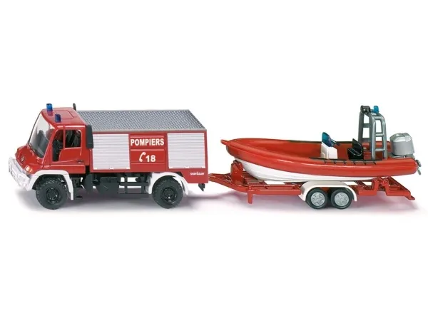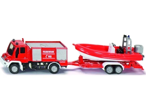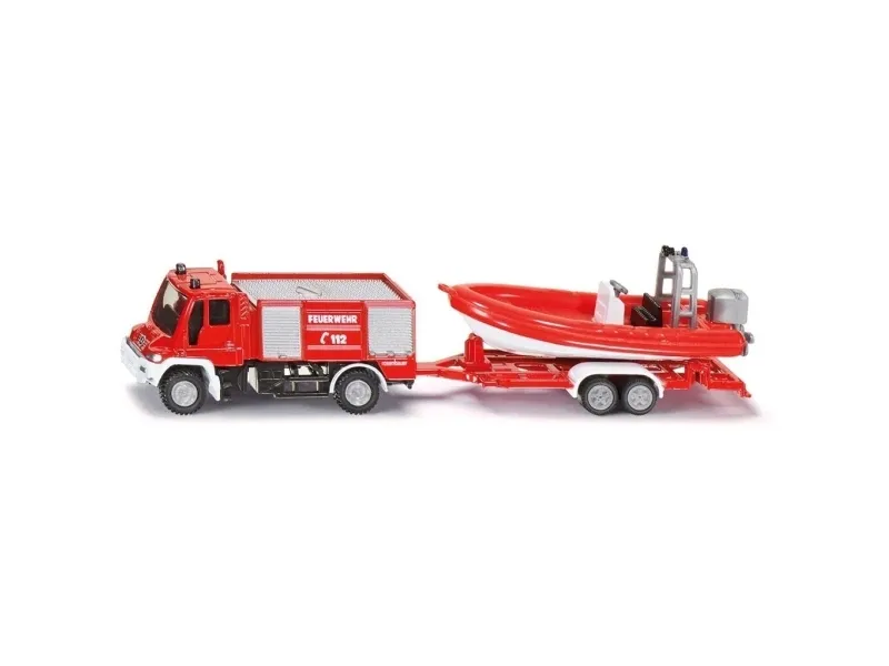 Unimog fire engine to 1:87 scale in metal. High-quality design with quality engravings and lettering. In combination with rescue boat on a tandem-axle trailer.