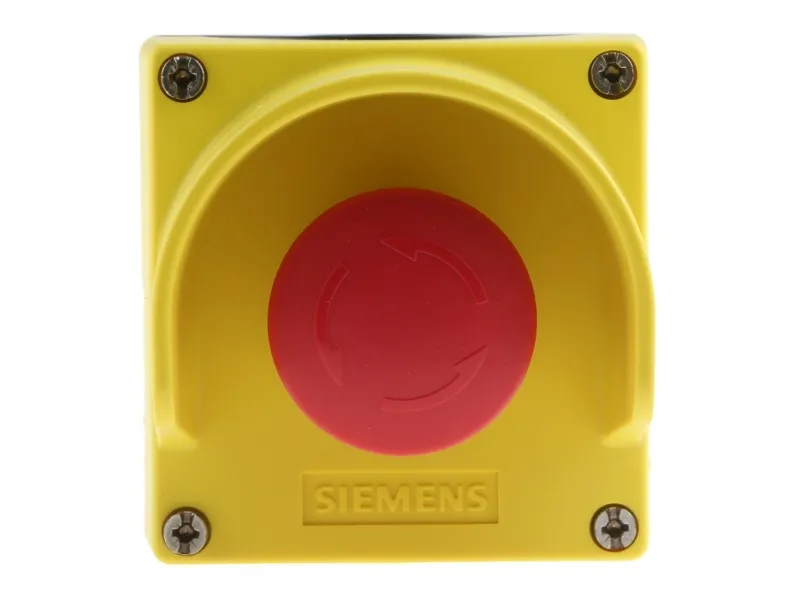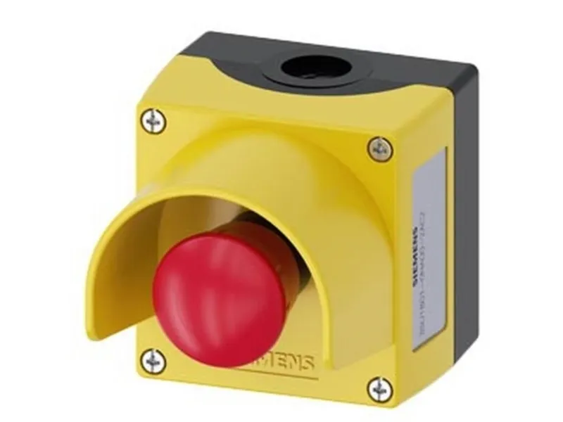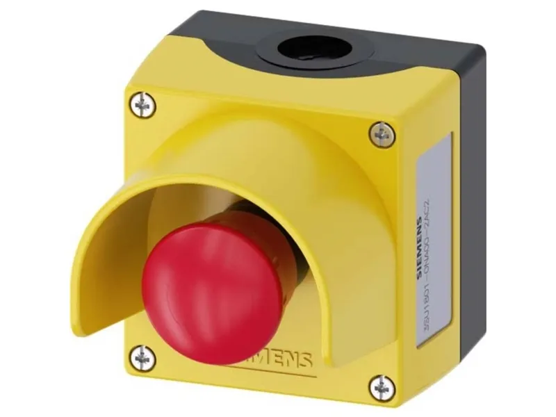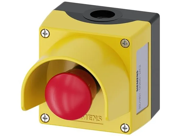 Enclosure for command devices, 22 mm Enclosure for command devices, 22 mm, round, Enclosure material plastic, Enclosure top part yellow, 1 control point plastic, with protective collar, A=EMERGENCY STOP mushroom pushbutton red, 40 mm, rotate-to-unlatch, 1 NC, screw terminal, floor mounting, 1xM20 each on top and bottom Enclosures SIRIUS ACT for mounting the 22.5 mm pushbuttons and indicator lights for separately allocated control units and cabinets. Under the brand name SIRIUS ACT, Siemens offers a unique portfolio of pushbuttons and signaling devices with global product approvals in four modern design lines of rugged genuine metal and high-grade plastic. An innovative snap-on concept makes the task of installing a unit so easy that it can be done with one hand and without any special tools. Groove-free holes are adequate as mounting holes since full twist prevention is already integrated. Thanks to the high degree of protection throughout, the rugged devices are suitable for use in industry and outdoors. Even cleaning with a high-pressure jet is possible. Neither dust, oils, nor caustic solutions can interfere with reliable operation. As well as standard wiring, the devices can also be connected to the controller via PROFINET, AS-Interface or IO-Link. Doing so will help you to reduce wiring time and effort, minimize error sources and have more flexibility. The graphical Online Configurator provides convenient support when selecting and ordering individual devices, enclosures and labels. Extensive documentation (e.g. manual, 3D data, terminal diagram) is available. Versions available: Yellow/gray, plastic/metal, 1-6 command points, empty enclosure/pre-equipped, optionally with AS-Interface connection. SIRIUS ACT - Performance in action for control and signalling. Simply mounted, simply strong, simply perfect.