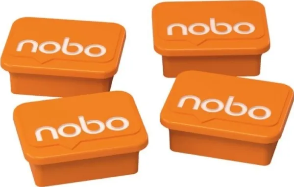 Plastic magnets suitable for displaying memos or messages neatly and securely on a Nobo magnetic dry wipe whiteboard. Pack of 4 magnets, 18x22mm in size holds up to 4 sheets of paper.
