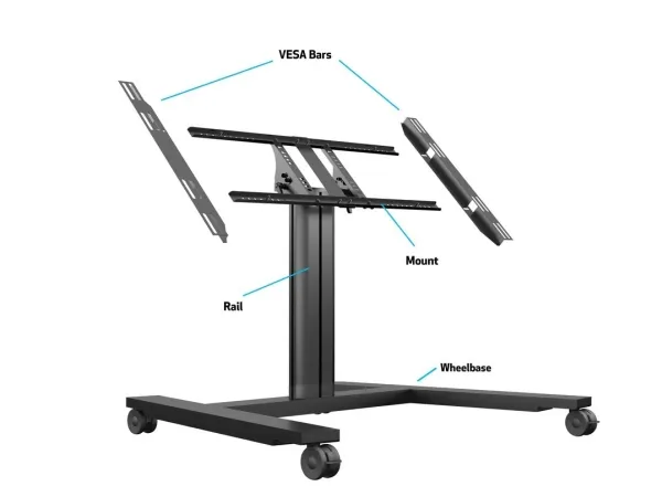 Place your new touchscreen as a table. Present your projects with the display tilted toward any viewer. Use the stand as a presenter for a product or interactive presenter. Make your presentations more interactive by providing new flexibility for a display or touch displays. With its simple to use tilt function, and easy movable transport, makes this the ideal solution for educational sector, tv studios and just about any company. The M Public Display Stand 80 HD Wheelbase Single has multiple accessories available, as computer shelf, cable holder and other accessories.