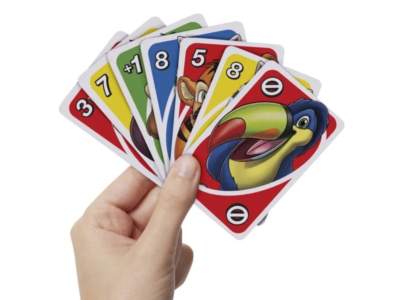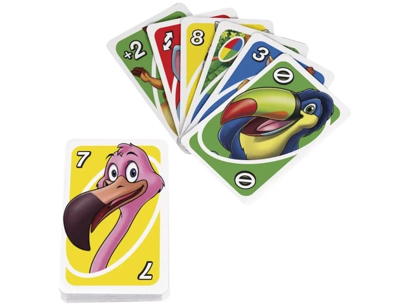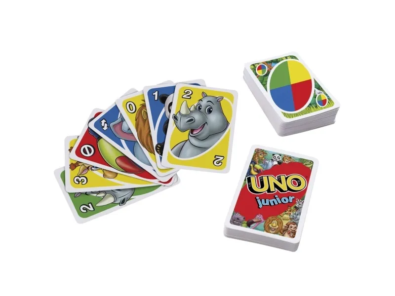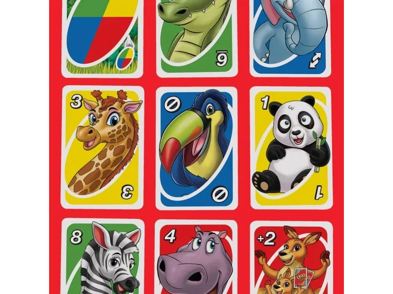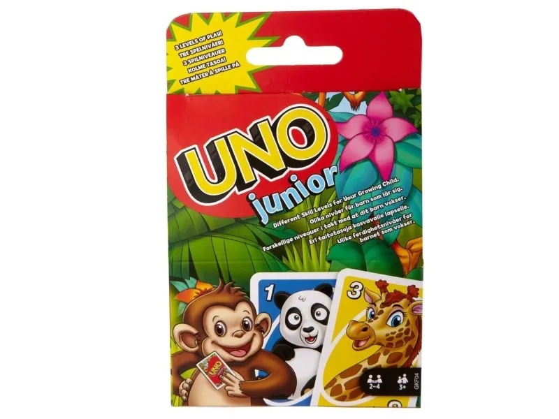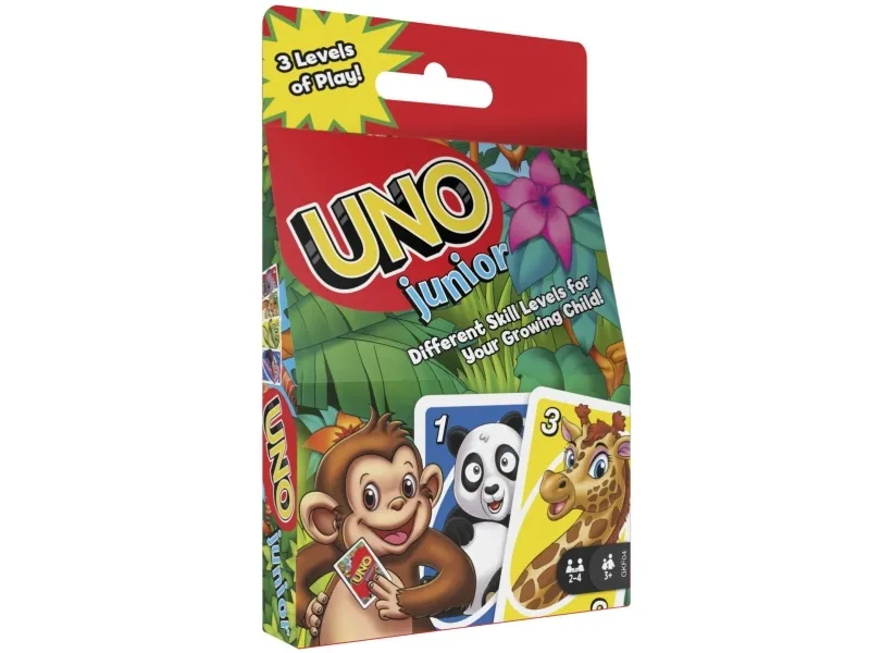 This simplified UNO card game for younger players has multiple levels of play so kids can grow with the game. Cards feature adorable zoo animal graphic for each number 0 through 8, making matching easy for kids as young as 3 years old. Three levels of play allow the game to keep pace with a child's development. Players race to get rid of all their cards by matching them to the card shown on top of the deck, either by color or by animal / number. When you're down to one card, don't forget to yell "UNO!" Colors and decorations may vary.