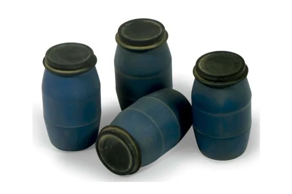 Four modern plastic drums with safety closures, for transporting different liquid substances.