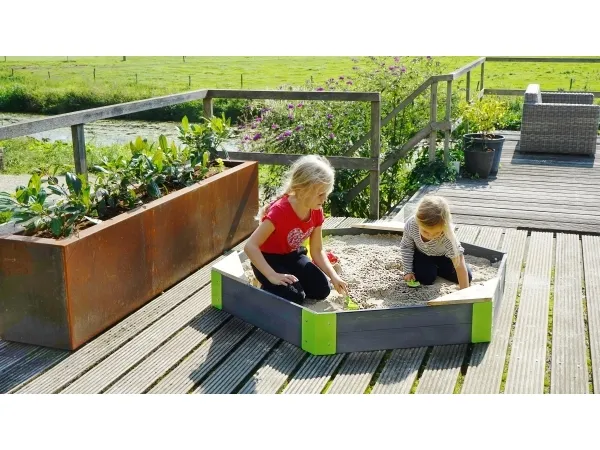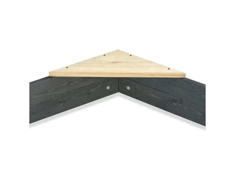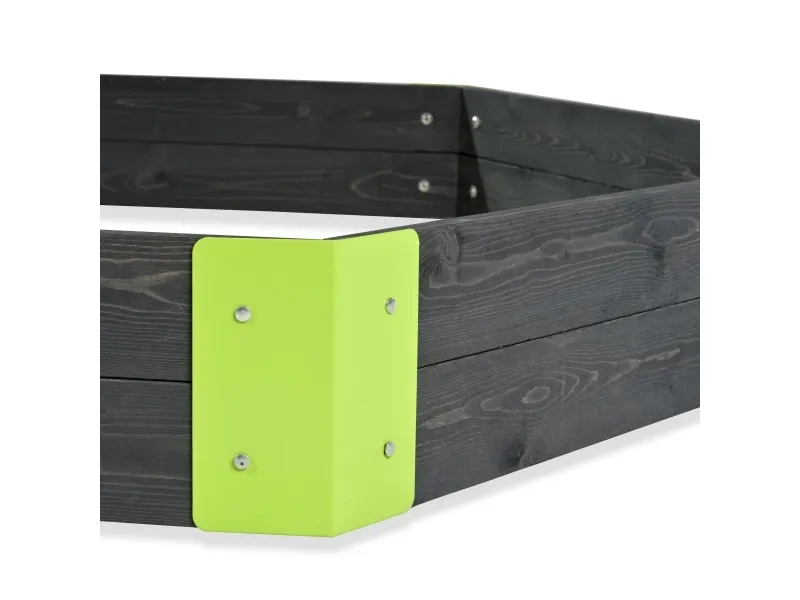 The Aksent wooden sandpits from EXIT Toys are easy to assemble and are super sturdy. The pre drilled holes are secured with metal couplings in the corners, which makes the sandpit very stable. The corners have been painted a distinct green colour and this, in combination with the grey coloured wood, gives the sandpits a nice and modern look.