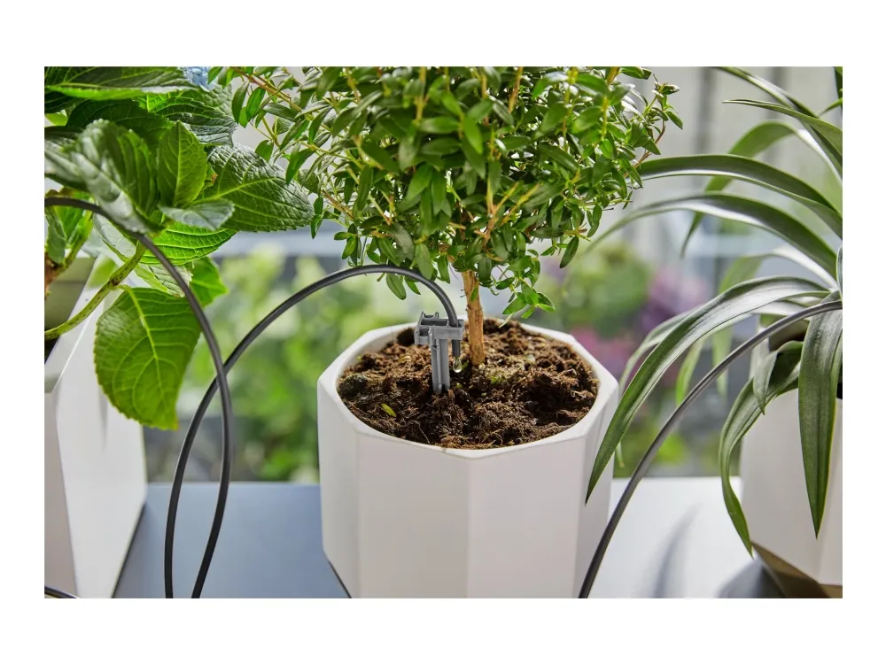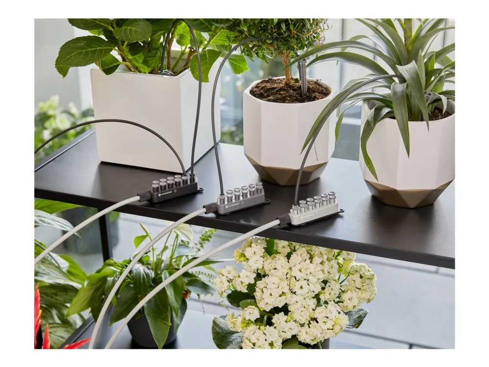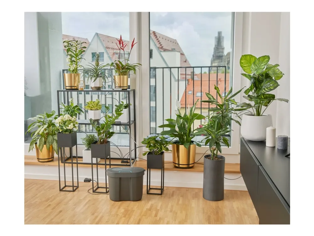 Automatic watering of up to 36 houseplants Whether you are on holiday or on a business trip or just too busy at home – with the GARDENA Holiday Watering Set you no longer need to worry about watering your house plants. Despite your absence, your plants will continue to be optimally watered. The watering system requires a power source, but no tap connection. You can place the Holiday Watering Set anywhere in your home near a socket. Thanks to the drip distributors with three different water delivery rates, up to 36 different houseplants – depending on the water requirement – are watered simultaneously for one minute per day, taking into account different water needs. The Holiday Watering Set includes all the necessary individual components and is ready to start immediately. The system is easy to set up and to get everything working. The accompanying water reservoir consists of 80 percent recycled material and is therefore the sustainable watering solution for your home or conservatory. It's even possible to connect to the irrigation pump for optimised water use. The reservoir can also be used as a practical storage option for the individual components of the set. Thanks to its slim design, the irrigation set can be inconspicuously placed in your home and hidden behind furniture. The clever, modern design of the system makes the watering set timeless and integrates perfectly into any living space. Of course, you can also use the set on your balcony. The water reservoir, which can be filled with up to 10.5 litres of water, ensures a reliable water supply. If you are travelling for a longer period of time, this is no problem either: thanks to the connection option, the water volume can be increased by connecting to extra water reservoirs. Plant care for when you’re not there. Independent irrigation for indoor plants.