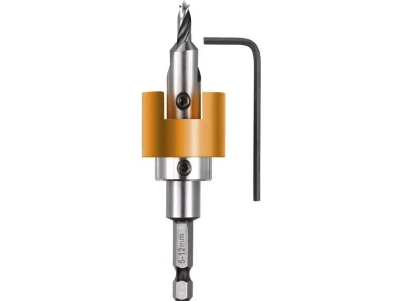 Hardwood drill bit, HSS-M2, with adjustable counterbore and countersink, ball-bearing counterbore stops rotating when it grounds, preventing marking of the wood, 1/4" hexagon shank to ISO 1173, E 6.3, for Bangkirai, hardwood, softwood, ideal for pre-drilling of hardwoods when working on decking or garden furniture, with perfect bore and countersink depth on every fixing.