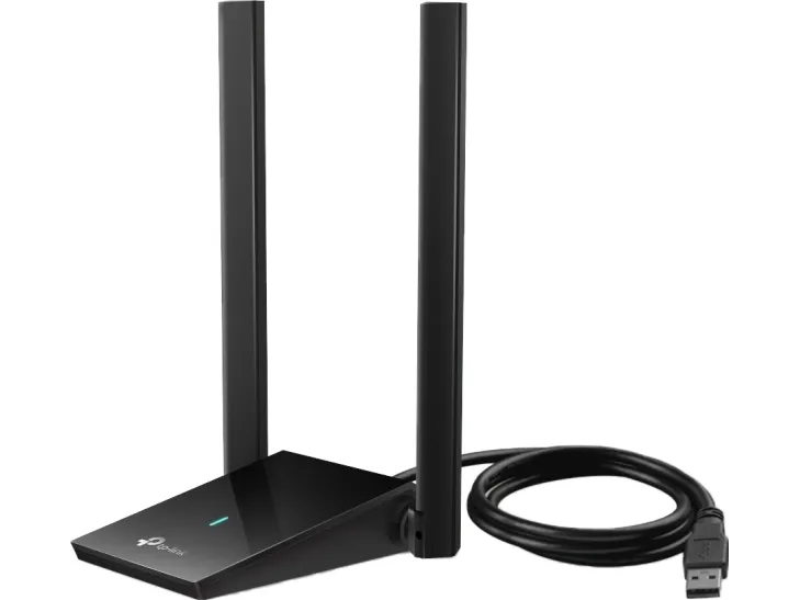 TP-Link AX1800 Dual Antennas High Gain Wireless USB Adapter. Connectivity technology: Wireless, Host interface: USB, Interface: WLAN. Maximum data transfer rate: 1800 Mbit/s, Wi-Fi band: Dual-band (2.4 GHz / 5 GHz). Antenna type: External, Product colour: Black