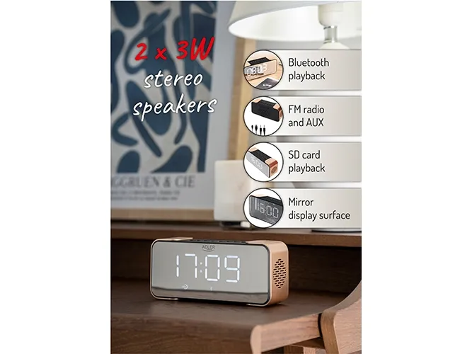 The radio alarm clock AD 1190 is a device with many useful functions that you can choose depending on your needs. First of all, it has 3 alarm clock modes. A big advantage is the readable LED display with 3 levels of backlight intensity, from which you can easily read the time . The alarm clock is powered by a Lithium Ion battery with a capacity of 1800 mAh. The device has a built-in FM receiver, Bluetooth 5.0, AUX and SD input.Adler AD 1190CR. Type: Digital alarm clock, Product colour: Black, Copper, Time format: 12/24h. Display type: LCD, Backlight colour: White. Audio system: stereo. Power source: Battery. Width: 190 mm, Height: 54 mm, Depth: 84 mm